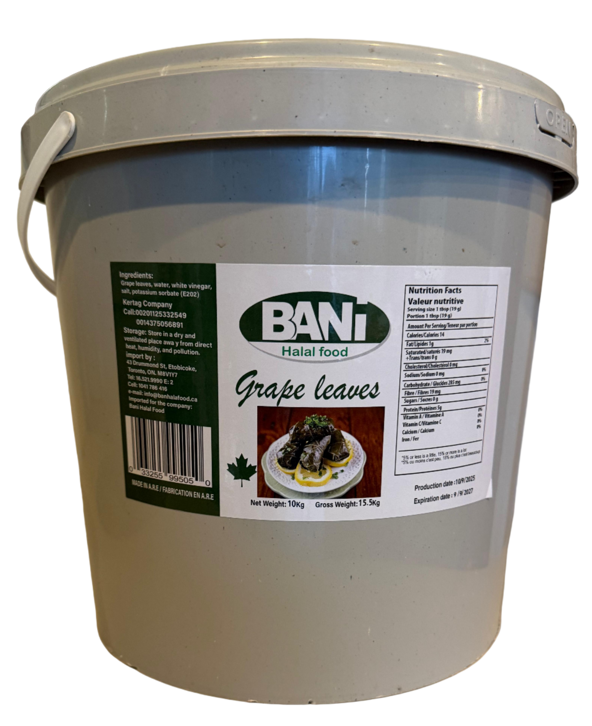 +14165219990Discover exceptional quality with our Grape Leaves – 15.5 KG Pail, designed for professional kitchens and high-volume food production. Each leaf is hand-selected for its perfect size, tenderness, and flexibility, making it ideal for preparing authentic stuffed grape leaves (dolma / warak enab).